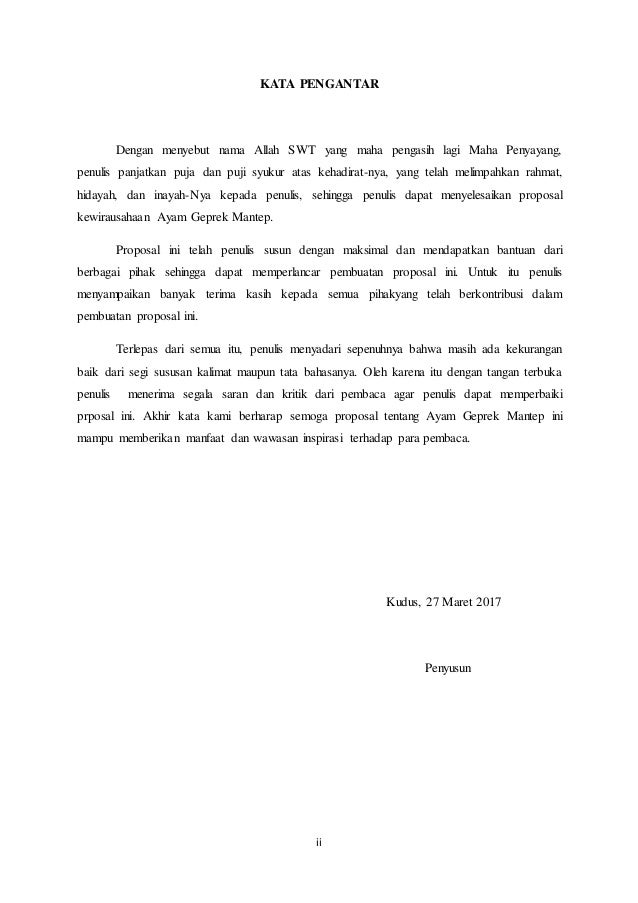 09 12 2020 Contoh Proposal Kewirausahaan KATA PENGANTAR Puji syukur penulis panjatkan kehadirat Allah SWT Karena berkat Rahmat dan Ridho Nya penulis dapat menyelesaikan Proposal Kewirausahaan ini sesuai dengan tenggang waktu yang telah diberikan oleh guru mata pelajaran Kewirausahaan